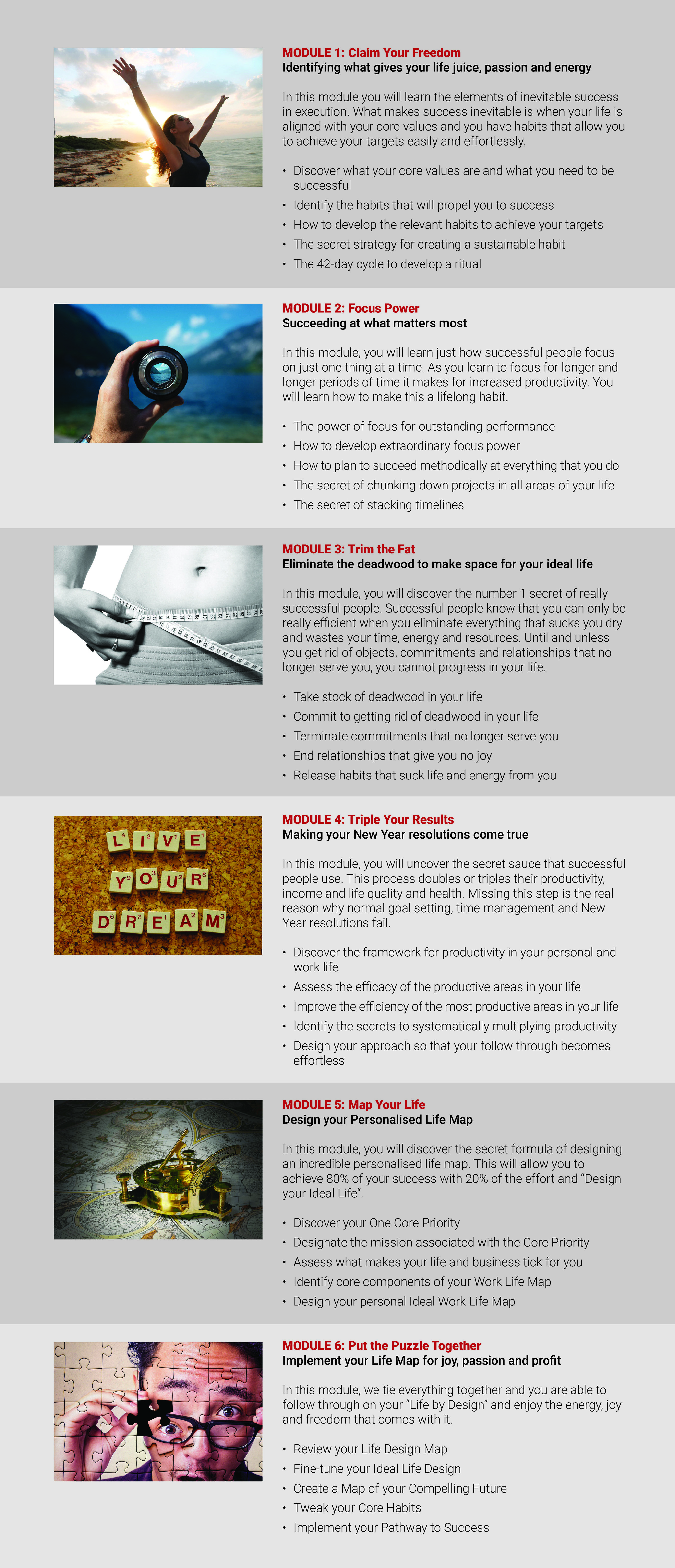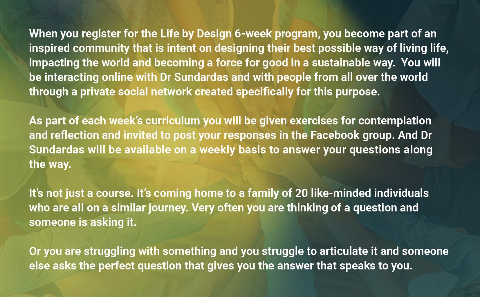 My promise to you is that by the end of 6 weeks you will have designed a life plan that will enable you to live a sustainable, juicy, thriving life on your terms filled with great health, wealth, wonderful relationships and freedom.